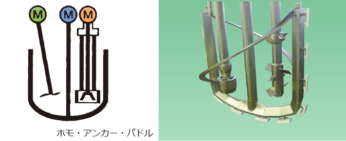 ●成為獨(dú)立型攪拌機(jī),可以選擇錨式刮板+高速攪拌機(jī)(分散攪拌機(jī)、均質(zhì)攪拌機(jī)、旋風(fēng)式攪拌機(jī))。 另外,也可以將高速攪拌機(jī)部變更為中心攪拌機(jī)。●根據(jù)高速攪拌的軸密封位置的不同,可以選擇固定螺栓式和管式。