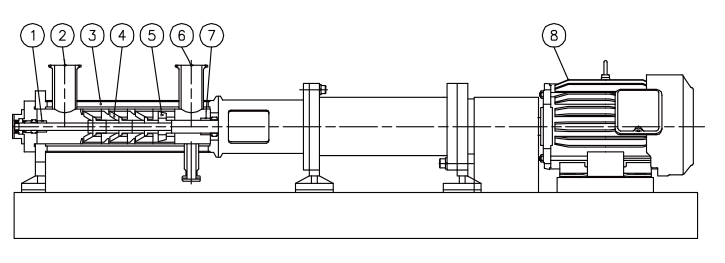 4片槳葉結(jié)構(gòu)①吸引側(cè)機(jī)械密封②吸引口③護(hù)套④低粘度型渦輪三段⑤高粘度型渦輪一段⑥吐出口⑦吐出側(cè)機(jī)械密封⑧電機(jī)