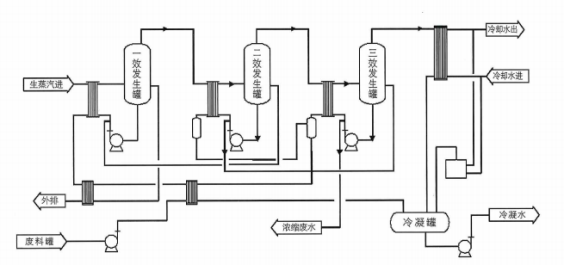 通過多效蒸發(fā)設(shè)備后,高濃度廢液中水分蒸發(fā),使物料濃縮,減少了物料量,并可對(duì)物料中高濃度物質(zhì)回收, 二次蒸汽沒有直接冷凝,而是作為加熱蒸汽,使其潛熱得到了較為充分的利用,提高了加熱蒸汽的利用率。 前效為加壓操作,所得到的二次蒸汽溫度較高,可作為下一效的加熱蒸汽加以利用。