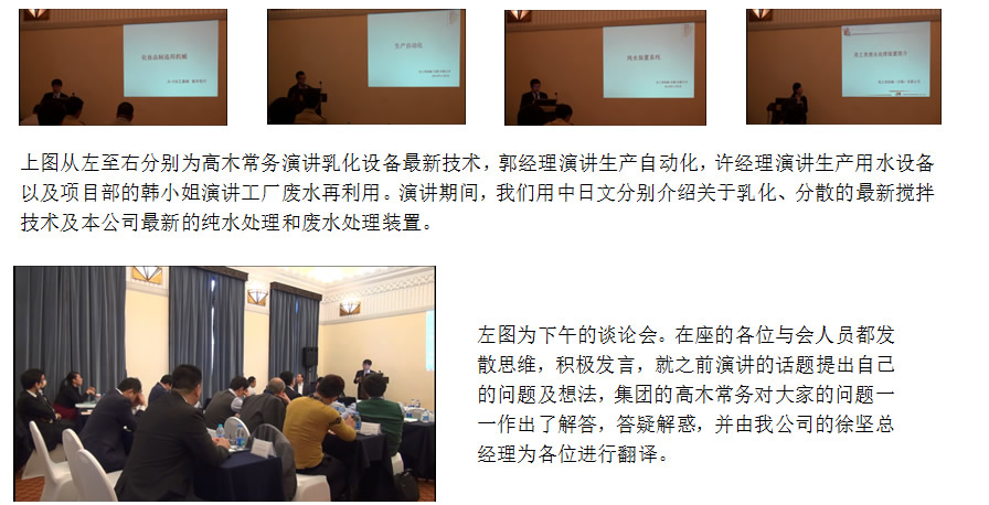 美之賀機械(無錫)有限公司于2015年11月5日在上海花園飯店舉辦了第二屆化妝品制造設備學術研討會,我們有幸邀請到集團社長兼美之賀機械(無錫)有限公司董事長悅勝三次先生和高木常務蒞臨了本次會議。家化、伽藍、卓多姿、諾斯貝爾等12家公司的31位來賓都應邀參加。本次研討會內容充實豐富,銜接緊湊,現場氣氛高漲,在各位與會人員的積極討論中取得了圓滿的成功。